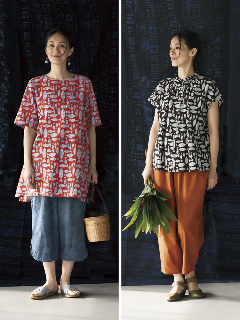柄を彫り込んだ木の塊(木版ブロック)を布に押し当てて一柄一色ずつハンコを押すように色を重ね、幾度も水洗いをし、太陽で乾かしながら手作業で作り上げる模様染めです。